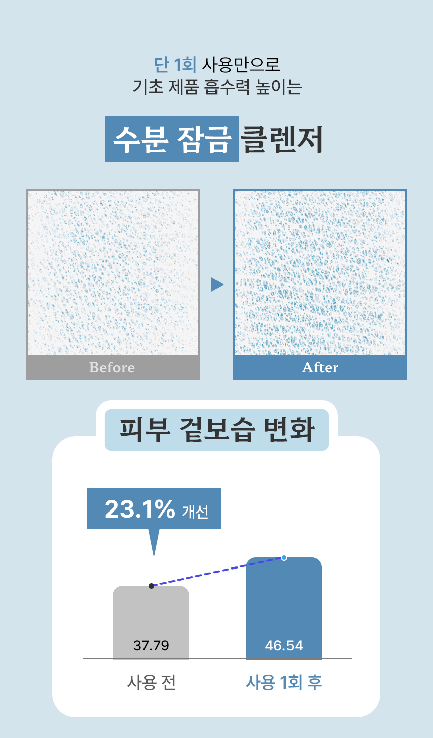 - 1회 사용 : 모공 속 노폐물 제거 99%, 수분 개선 23%, 유분 개선 86%