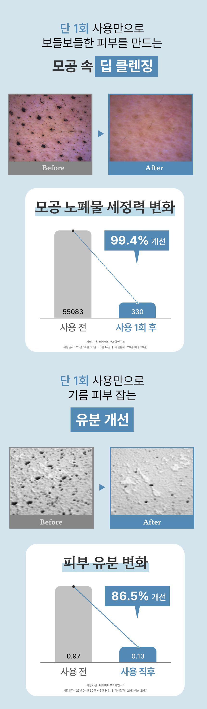 - 1회 사용 : 모공 속 노폐물 제거 99%, 유분 개선 92%, 수분 개선 17%