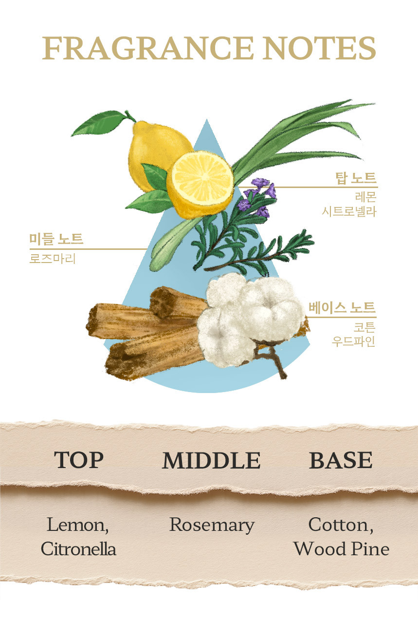 햇살에 말린 리넨 시트처럼 포근한 레몬코튼 향이 그 시절의 목욕 후 풍경을 오늘에 머물게 합니다.